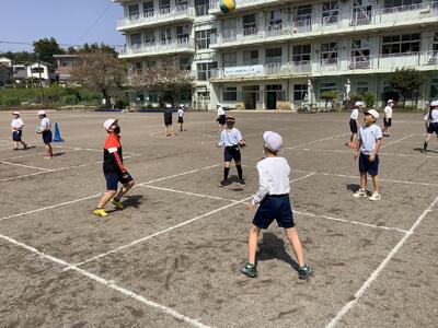 5年生の体育の様子です。50m走や100m走の記録測定を行った後に、「天大中小」というボールゲームを行いました。相手の陣地にボールを打ちつけてラリーを続け、ミスをすると陣地を交代していくゲームです。「天」が最上位の陣地で「大」→「中」と続き、「小」が最も位の低い陣地です。より上の陣地に入ろうと進んで取り組んでおり、白熱したゲームとなりました。