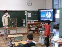 算数ボックスに入っている時計を実際に動かしたり、電子黒板に映された時計を見たりしながら、時計のしくみについて考えました。「1から12までの数字でできている」、「長い針が1週回ると、短い針が数字1つ分動く」など、子供たちは気付いたことをたくさん発表していました。