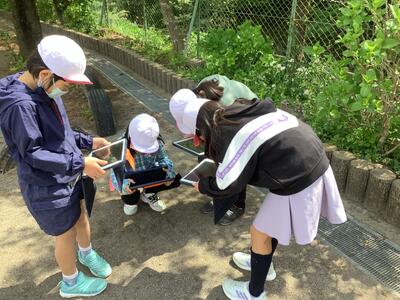 4年生の理科「あたたかくなると」の学習でも、校庭にいる生き物をタブレットを使って観察しました。草むらや木の表面、「こんなところにいるんだよ」と大きな石の下ものぞきながら写真を撮ったり、見つけた生き物の動きをじっくり観察する姿がありました。