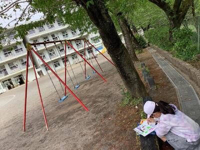 教室ではなく、運動場に出て描く活動に、「外で何かするってやっぱいいな~!」と、開放感を感じながら、活動に望むことができました。