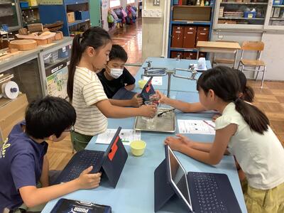 4年生の理科「雨水のゆくえと地面のようす」の学習で、①砂場の砂と②校庭の砂、どちらの方が水が染み込みやすいかをタブレットの中にあるストップウォッチ機能を使い、班ごとに実験をしました。砂場の砂の方が粒が大きく、隙間がある分、水が早く染み込むことがわかりました。