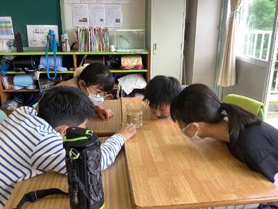 5年生の理科の様子です。メダカの雌雄をヒレに注目して判別しようとしたり、解剖顕微鏡を使ってメダカの卵の様子を観察しました。調節ねじを上手く使って、くっきり見れた時、とても嬉しそうにしている子どもたちでした。