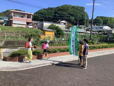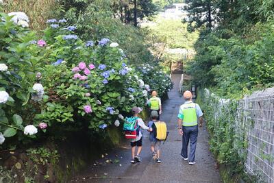 沢地小の子供たちは、スクールガードの皆様に毎日あたたかく見守られ、元気に登校しています。がんばり坂のあじさいが、とてもきれいに咲いています。