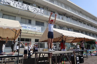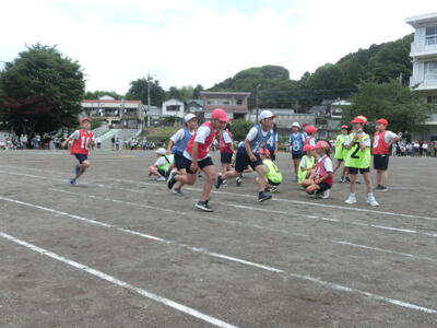 学校対抗リレー「バトンをつないで」では、どのチームも上手にバトンをつなぎ、大接戦となりました。