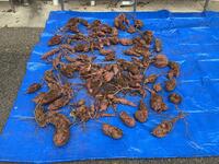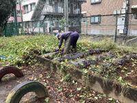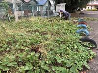 用務員さんが、サツマイモのつるを切っています。