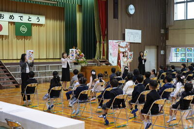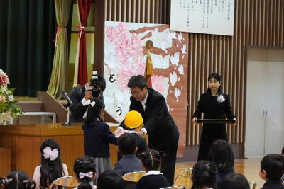 校長先生、PTA会長、担任の先生の話に時折「はい」「〇〇だ!」と反応しながら、しっかりと聞くことができました。式では、教科書とヘルメットが授与されました。月曜日から、安全に気をつけて登校し、楽しく学び、友達と仲良く遊びましょう。