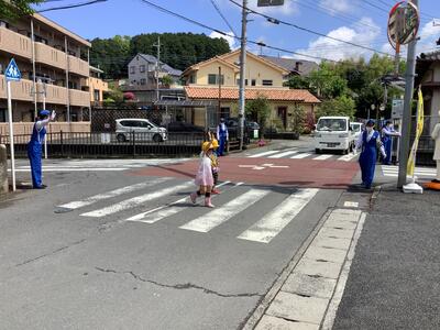 1年生は、教室で左右の確認だけでなく、前後から曲がってくる車もしっかり見ることが大切と教わりました。その後、学校近くの交差点で実際に安全の確認をしてから横断する練習をしました。緊張しながらも上手にできていました。