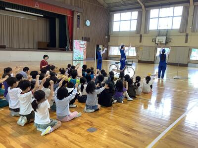 3年生は、体育館で自転車の乗り方について教わりました。ヘルメットを被る大切さ、自分の体に合った自転車に乗ること、ブレーキの掛け方などたくさんのことを学びました。