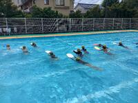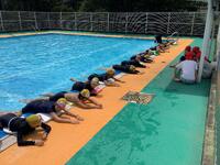 平泳ぎの足の動きをプールサイドで確認した後、実際にプールの中で確認しました。正しい足の動きに近づいたことで、一蹴りで進む距離が伸びていました。
