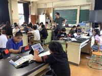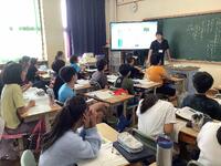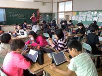 子供たちは、タブレットを見て、過去のデータを参考にして、予想しようとしています。