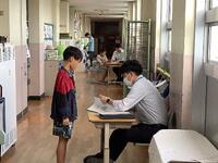 先生が、子供一人一人に通知表を渡しながら、言葉を掛けていました。