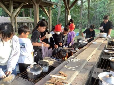 飯ごう炊さんを終え、それぞれが持ち寄ったカレーとフルーツポンチを食べました。