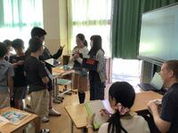 四角形の向かい合った頂点を直線で結んで気づいたことを話し合っています。