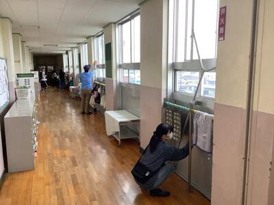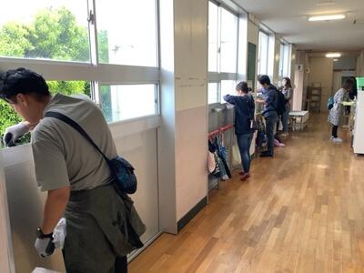 雨にもかかわらず32名の方に来校いただき、廊下、階段、昇降口の清掃をしていただきました。