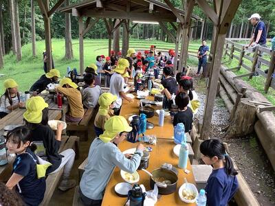 大自然の中で食べる、自分たちで作ったカレーは格別です。みんなモリモリ食べていました。少し早い夕飯でしたが、中にはおかわりをする子もいました。