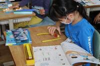 5年生の家庭科の授業では「裁縫道具」をつかって「はじめてのソーイング」の学習をしています。今日の授業では、これから使うソーイングセットの道具について確認しました。その後は、練習布をつかってソーイングの練習です。