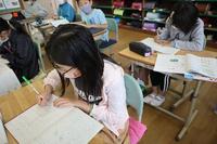 5年生の教室では、子どもたちが「道」の毛筆の学習に取り組んでいます。手本をみながら、「しんにゅう」の練習をしています。じっくりゆっくり筆を進めて真剣です。