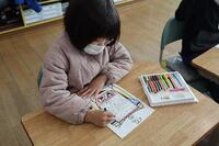 1年生の教室では、子供たちが「今年のめあて」をカードに書いています。一文字ずつ丁寧に書いて色もきれいにぬっています。