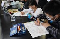 5年生の教室では、子どもたちが「道」の毛筆の学習に取り組んでいます。手本をみながら、「しんにゅう」の練習をしています。じっくりゆっくり筆を進めて真剣です。