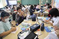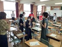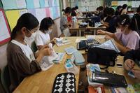 5年生は裁縫セットを使った活動をしています。この日はボタンを取り付ける学習をしています。