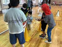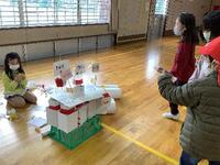 乳酸菌飲料の入れ物をロケットのように飛ばす遊びや物を転がす遊び、紙コップを飛ばす遊びなど、2年生が上手に説明して、1年生が楽しむ様子が見られました。