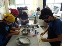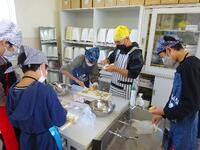 まず、じゃがいもの取り扱い方を全員で学びました。洗って皮をむき、芽を取る・・・しっかり学習しました。ジャーマンポテトにチーズをトッピングしたり、ポテトサラダにさつまいもやりんごを入れるなど、それぞれに工夫を凝らしていました。役割分担を決めて、手際よく進めていました。できあがった料理は、タッパーに入れて教室に持ち帰り、給食の時間においしくいただきました。生活に役立つ力をまた一つ身に付けた6年生でした。