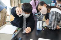 4年生の理科の授業では、「いろいろな実験器具の使い方をまとめよう」の学習課題に取り組んでいます。グループの友達といっしょに、メスシリンダー、ビーカー、ピペット、ろうと、スライドガラスなどの実験器具の使い方を学習していきます。真剣な表情です。4年生での学習体験が5年生の学習につながっていきます。