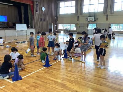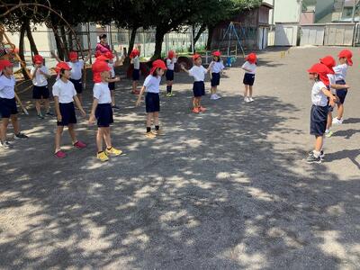 1組は準備体操中でした。日陰で体操し、その後も日陰で遊具遊びを楽しみました。