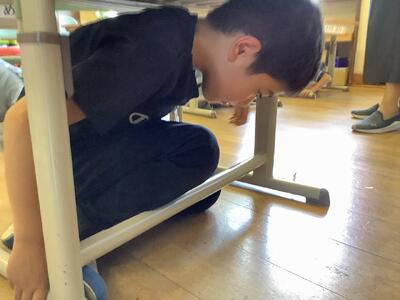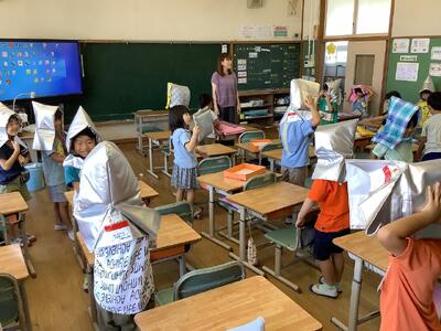 2回目の練習は、なんと30秒ほどでずきんを被って並べました。しっかり命を守る訓練ができたようです。