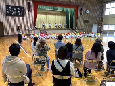 フォークダンスでは学年で輪になって踊り、出し物では互いに拍手や声援を送って楽しんでいました。