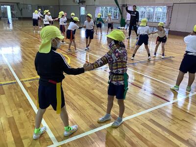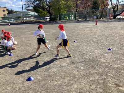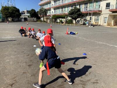 腰に巻き付けたタグを攻守を変えて取る活動や、ラグビーボールをパスする活動を楽しく行いました。