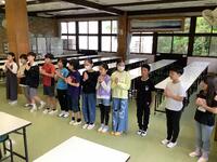 朝からあいにくの雨ですが、朝の集いではラジオ体操を清々しく行い、おなかぺこぺこで朝食を迎えました。