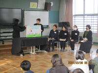 最後の出し物は、6年生です。6年生は、各学年の出し物に込められたお祝いの気持ちをしっかりと受け止め、それに対する感謝の言葉を力強く発表しました。その後、卒業式で歌う合唱曲「絆」を披露しました。体育館に流れるきれいな歌声に、下級生たちは聴き入っていました。在校生たちに、最高学年としての存在感を示した出し物となりました。