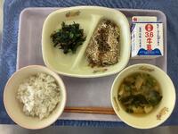 ☆麦入りご飯☆牛乳☆サワラのレモン醤油あえ☆お浸し☆味噌汁