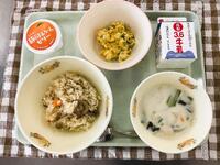 ☆五目炊き込みご飯☆牛乳☆やきつくね☆煮浸し☆味噌汁