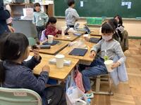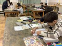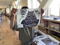 5年生、図画工作の様子です。お気に入りの風景を版画にしていました。ローラーを縦横に何度も転がして、インクをムラなく均一につけます。紙の中心に片手を置いて紙を押さえ、もう一方の手でバレンを握り、中心から空気を抜くように刷り写し取っていきます。ゆっくり剥がしたら完成です。