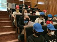 国会議事堂の見学の様子です。はじめに、「参議院特別体験プログラム」に参加しました。本校と東京都の小学校2校の参加です。この体験では、法律成立について、法務委員会と本会議を疑似体験しながら学んでいきます。本校代表者は、法務大臣役や副大臣役、委員役としてプログラムに参加しました。