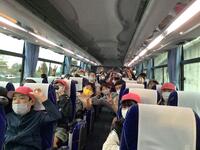 加茂公園からバスに乗車した6年生は目的地に向けて移動中です。バスの中では、それぞれのクラスでレク係が企画したレクリエーションを実施しています。