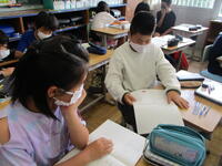 3年生の国語の授業の様子です。「食べ物のひみつをさぐろう」という単元で、いろいろなものに姿を変えて食べられている食べ物について、紹介する文章を書きます。子供たちは、自分で食べ物を選び、どのように姿を変えるのか調べて文章を考えていました。集中して取り組んでいるようすがいいですね。