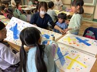 1年生、図画工作の様子です。ローラーを使って画用紙に色を付けたら、乳飲料の空き容器や段ボール、オクラをスタンプにしてペッタンペッタン。いろいろな模様で素敵な作品が完成ました。