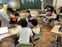3年生「健口教室」の様子です。健康な歯についての学習です。歯に歯垢染色液をつけ、歯の磨き方をチェックしていました。歯のつけねや、歯の間が赤く染色されている子が多かったです。こういったところが磨き残しの多いところです。その後、歯の丁寧な磨き方を教えていただきました。「10歳までは、ぜひおうちのかたの仕上げ磨きを!」と歯科衛生士さんからの言葉です。よろしくお願いします。