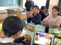 4年生、理科の様子です。「フラスコの口に石けん水でまくを作り、手で温めると膨らんできます。さて、どうしてでしょう。」という課題に取り組んでいました。子どもたちからは、「1回目はすぐに膨らんだけど、2回目はなかなか膨らまない。」「フラスコを逆さにしたらどうなるんだろう。」等々、様々な疑問が出てきました。