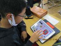 3年生の社会の授業の様子です。「火事からくらしを守る」学習の一環で、学校にある火事に備えた設備を調査していました。校内にはどれだけの数の火事に備えた設備があるかを1人1台端末で撮影して記録していきます。防火扉、消火器、消火栓、熱感知器、煙感知器などがどこにあるかを確認していきました。たくさんの設備によって、火事から学校を守るようにしていることに気付いた子供たちでした。