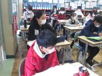 6年生算数の授業は比例の学習です。紙の枚数が増えると重さも比例して増えていくのではないかという予想を立て、実験し結果を得たレポートから、結論として何が言えるのかを追究しています。紙の重さは枚数に比例していることから・・・・さぁ皆さん自分の言葉で入れてみましょう。
