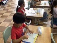 1年生の書写の授業の様子です。ひらがなの学習も進んできて、それぞれのクラスで、ひらがなを書く際に気を付けたいことを確認する学習をしていました。子供たちは、注意深く集中してひらがなを書いていました。一生懸命書いている姿はいいですね。