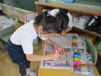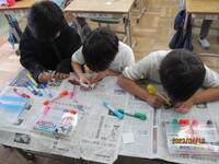 3年生の子供たちが、1年生の入学を祝うプレゼント「びゅんびゅんごま」を作っていました。「1年生の子は、こういうキャラクター喜ぶかな?」と相手を思い浮かべながら、丁寧に作業をしていました。1年生が喜んで、このプレゼントでたくさん遊んでくれるといいですね。