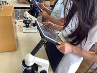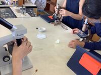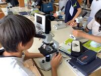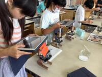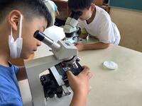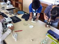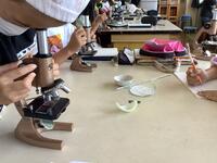 5年生理科で光学顕微鏡の使い方を、試料にメダカの稚魚を使って訓練しました。稚魚は動くので親指を使って追いながら観察します。