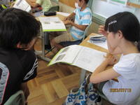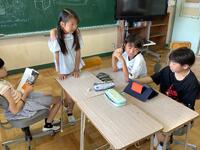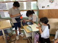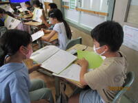 5年生は総合学習の時間に「米」を教材にし、個人テーマを設定して調べ学習を進めています。「稲を丈夫に育てるには?」「米にはどんな種類があるの?」「日本と世界の米作りや料理法の違いは?」「稲の病気や害虫は?」など、様々なテーマが設けられています。今日は、これまで自分が調べてきた内容を班の友達に報告し、夏休みにさらに学習を深めるにはどうしたらよいかを考えました。ベランダで育てているバケツ稲も元気に大きく育っています。