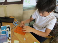 5年生の家庭科では、基本の縫い方を学習した後に、ティッシュカバーの制作に取り組んでいます。フェルトの色によく映える糸の色を選び、きれいな縫い目になるようにと慎重に作業を進めていました。自分の名前やワンポイントの刺繍を施し、飾りボタンをつけて完成です。「できた!」と嬉しそうな表情が、印象的でした。