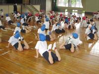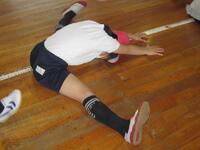 2年生体育の授業の様子です。柔軟性を高める運動です。前屈や開脚、上体そらしなどに挑戦しています。けがの防止にも柔軟運動は大切です。毎日家でも空いている時間に行うと少しずつ柔らかくなりますよ。